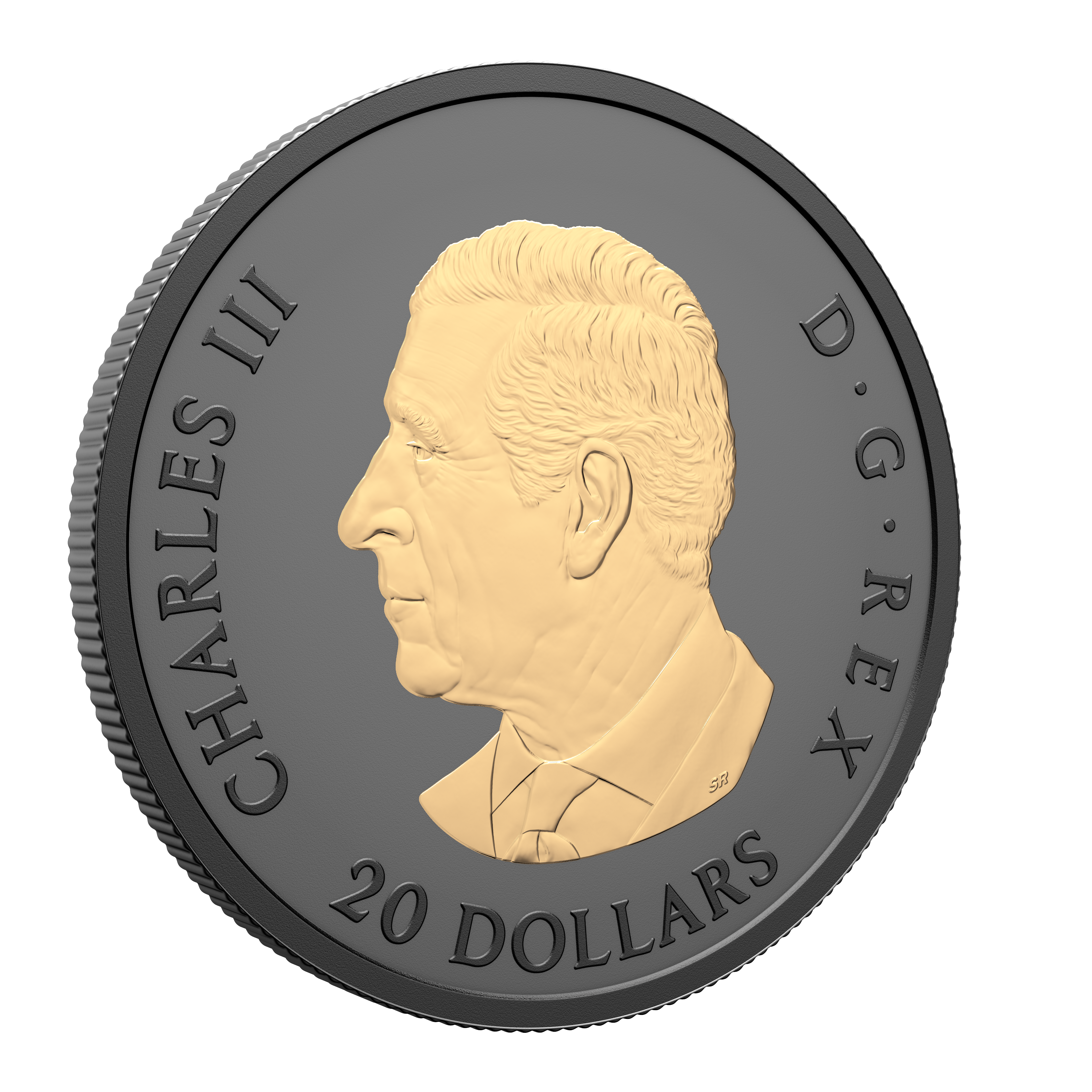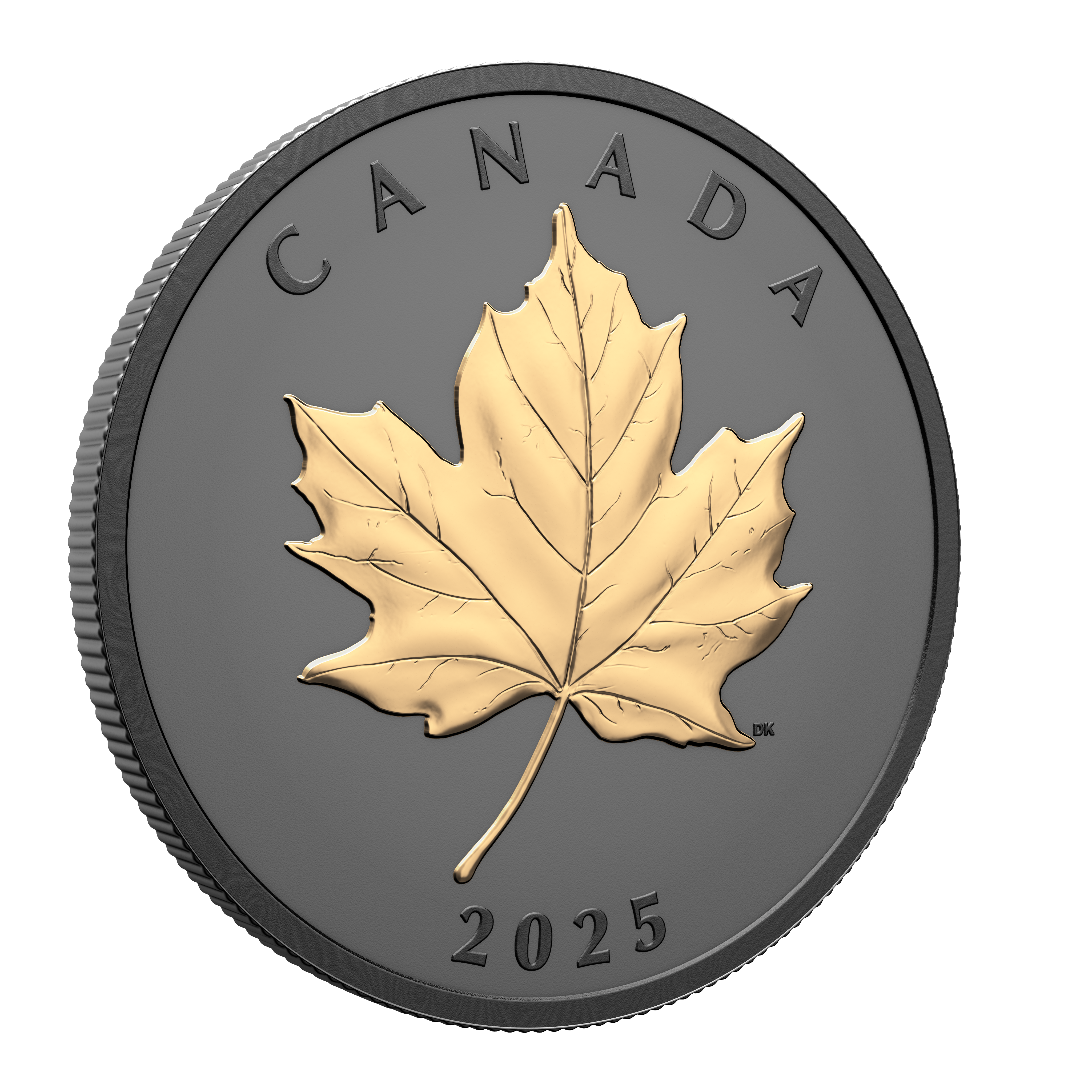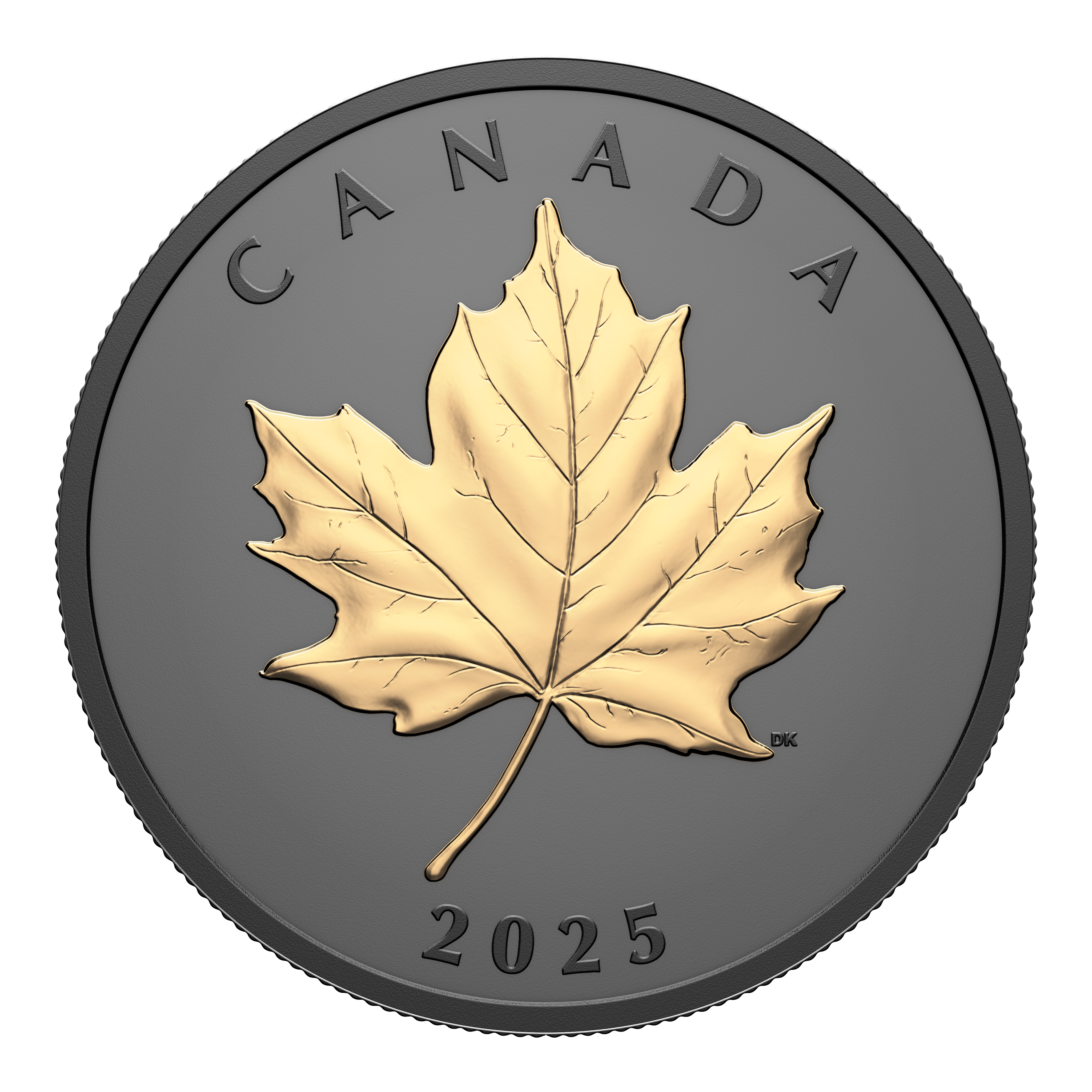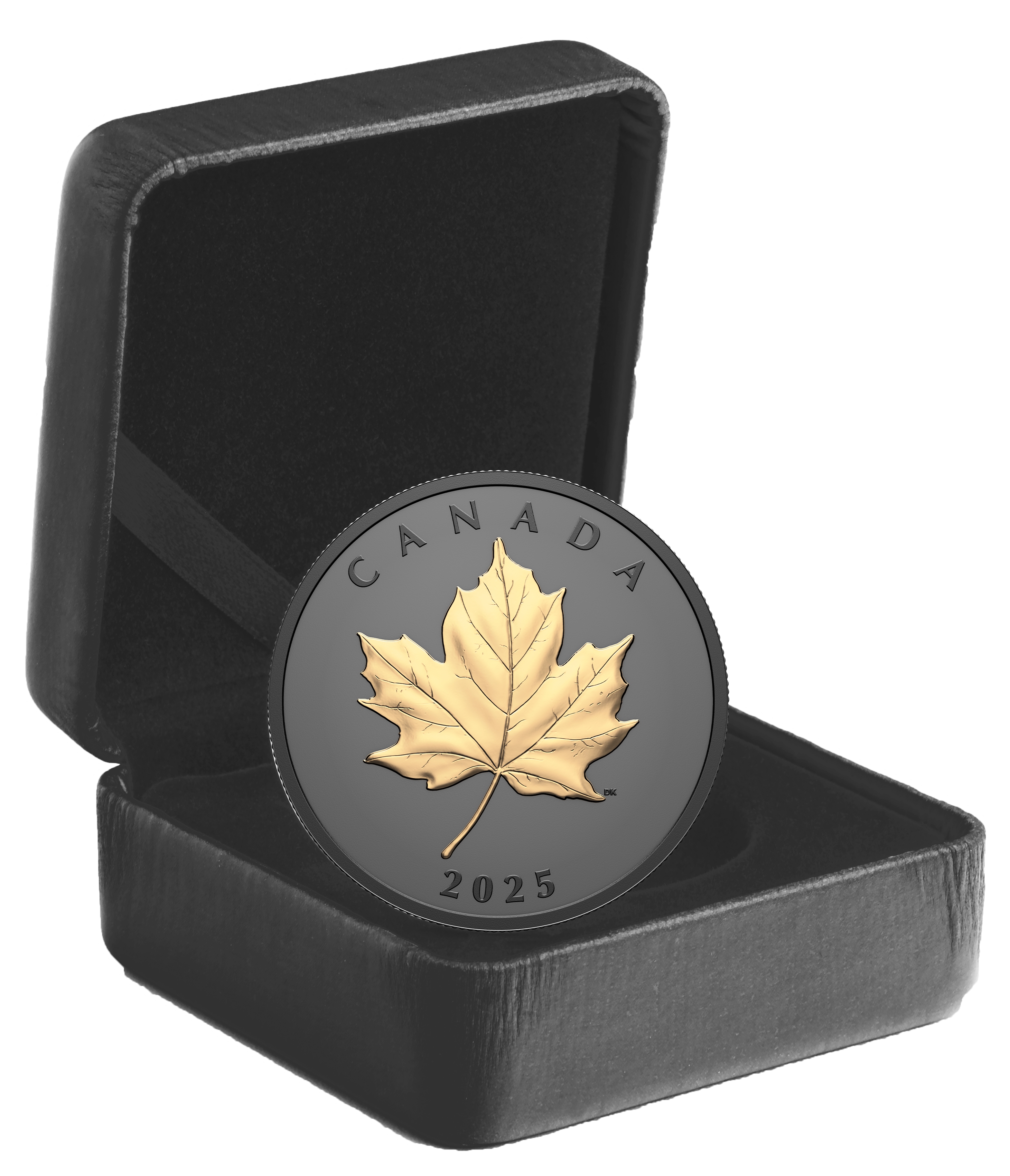 A single gold maple leaf glows with quiet elegance against a black backdrop, capturing the fleeting beauty of autumn in perfect stillness. Enhanced with selective gold plating, this 1-oz. 99.99% pure silver coin features a black rhodium plated field that puts all the focus on the elegant maple leaf, creating a striking contrast that transforms the beloved Canadian emblem into a shining symbol of resilience and natural grace.