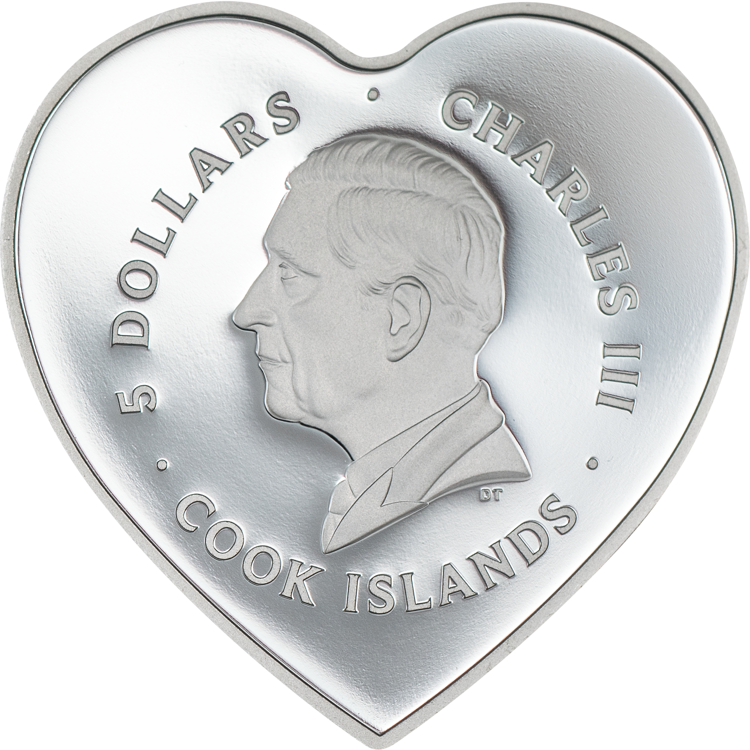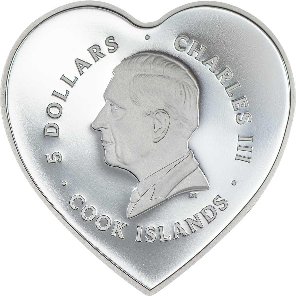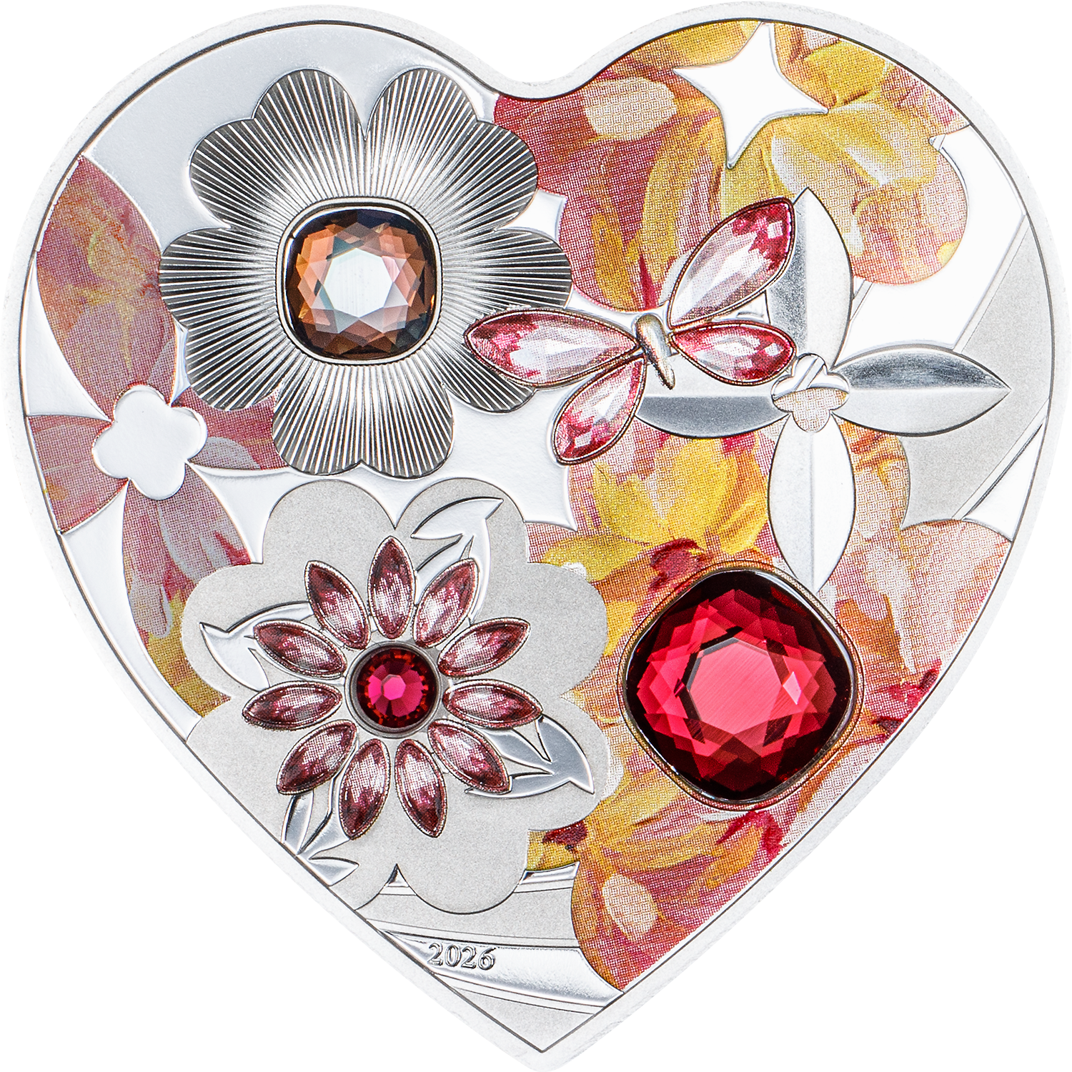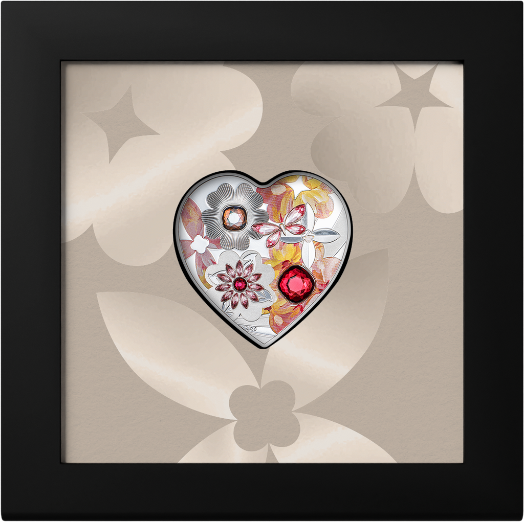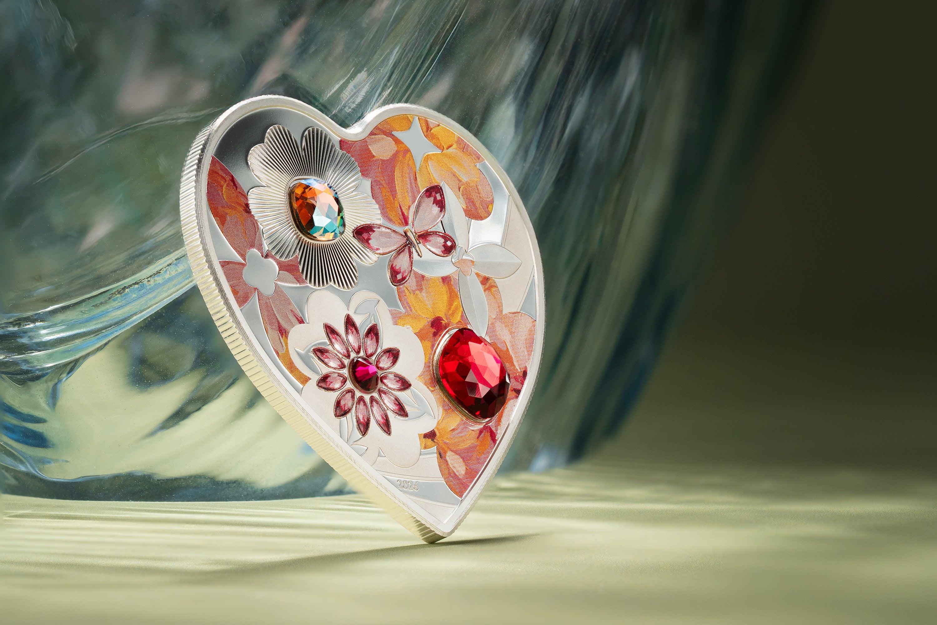 Three sparkling crystals add refined accents, giving the coin a special brilliance, while the proof background masterfully highlights the intricate details. The combination of floral motifs, subtle colors, and exquisite crystal elements makes this Silver Hearts coin a unique gift for romantic and special occasions.