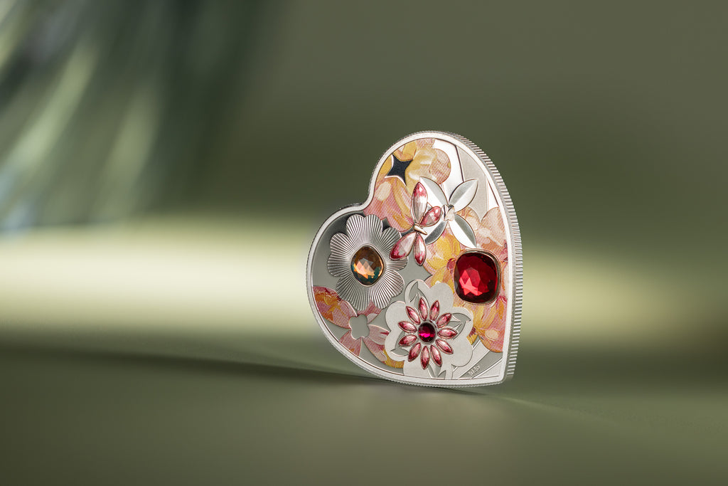 This extraordinary heart-shaped coin, struck in classic minting, combines artistic flair with modern design. Delicate graphic flowers blend with vibrant coloring, creating a lively motif that reflects the lightness and grace of nature.