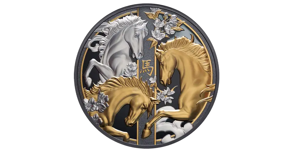 The design is further enhanced by the addition of selective gold plating, which introduces a striking contrast between the deep, lustrous Black Proof finish and the warm, amber-colored gold highlights. This combination not only emphasizes the intricate details of the horses but also adds depth and richness to the overall appearance of the coin. The result is a stunning piece that appeals to collectors and enthusiasts alike, combining artistry with the inherent value of fine silver.
