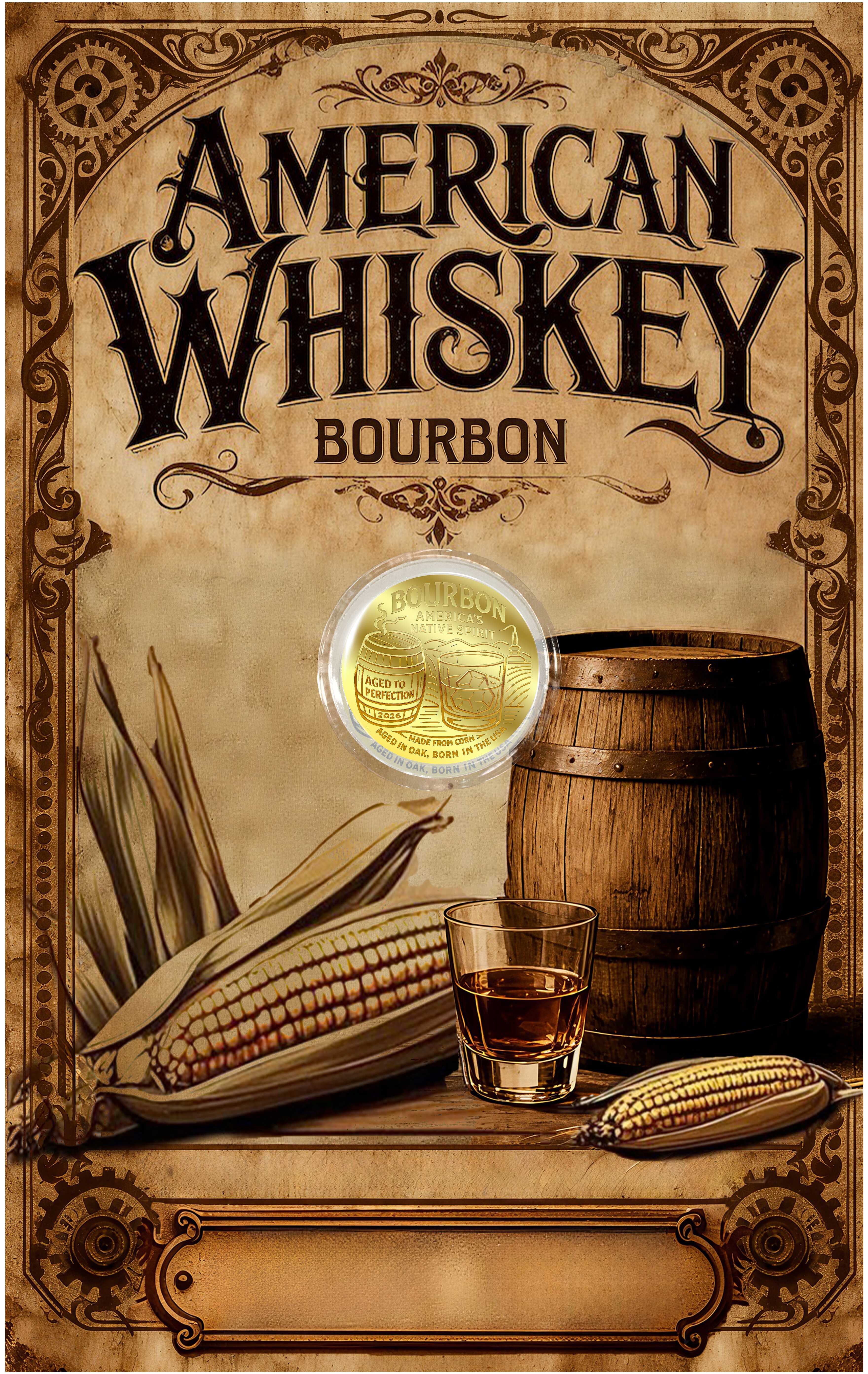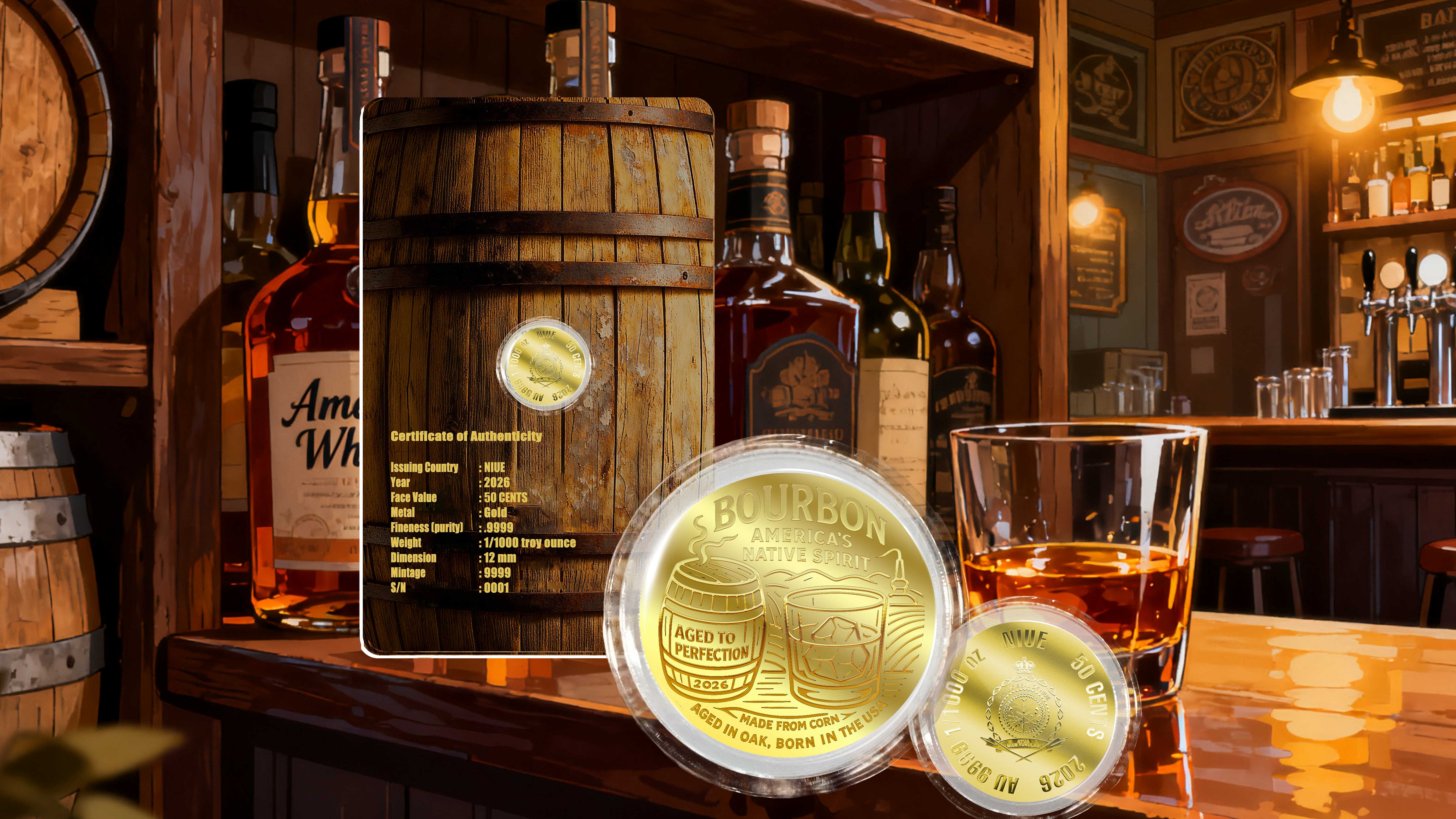This stunning 1/1000 oz Gold coin celebrates the rich heritage of American Whiskey, symbolizing craftsmanship and culture since the Whiskey Rebellion of 1791. Crafted from .9999 fine Gold, the coin features a classic design with a whiskey barrel and glass motif, paying tribute to America’s native spirit. It is presented in a themed card that includes an embedded Certificate of Authenticity, with a limited mintage of only 9,999. The reverse side of the coin showcases a detailed design dedicated to Bourbon, featuring the inscription “Aged to Perfection” alongside a whiskey barrel and glass, along with phrases like “MADE FROM CORN,” “AGED IN OAK, BORN IN THE USA,” and the year “2026.” The obverse displays the Public Seal of Niue, along with inscriptions indicating the issuing country, face value of “50 CENTS,” the year of issue “2026,” the fineness of Gold “AU 9999,” and the coin's weight “1/1000 OZ.”