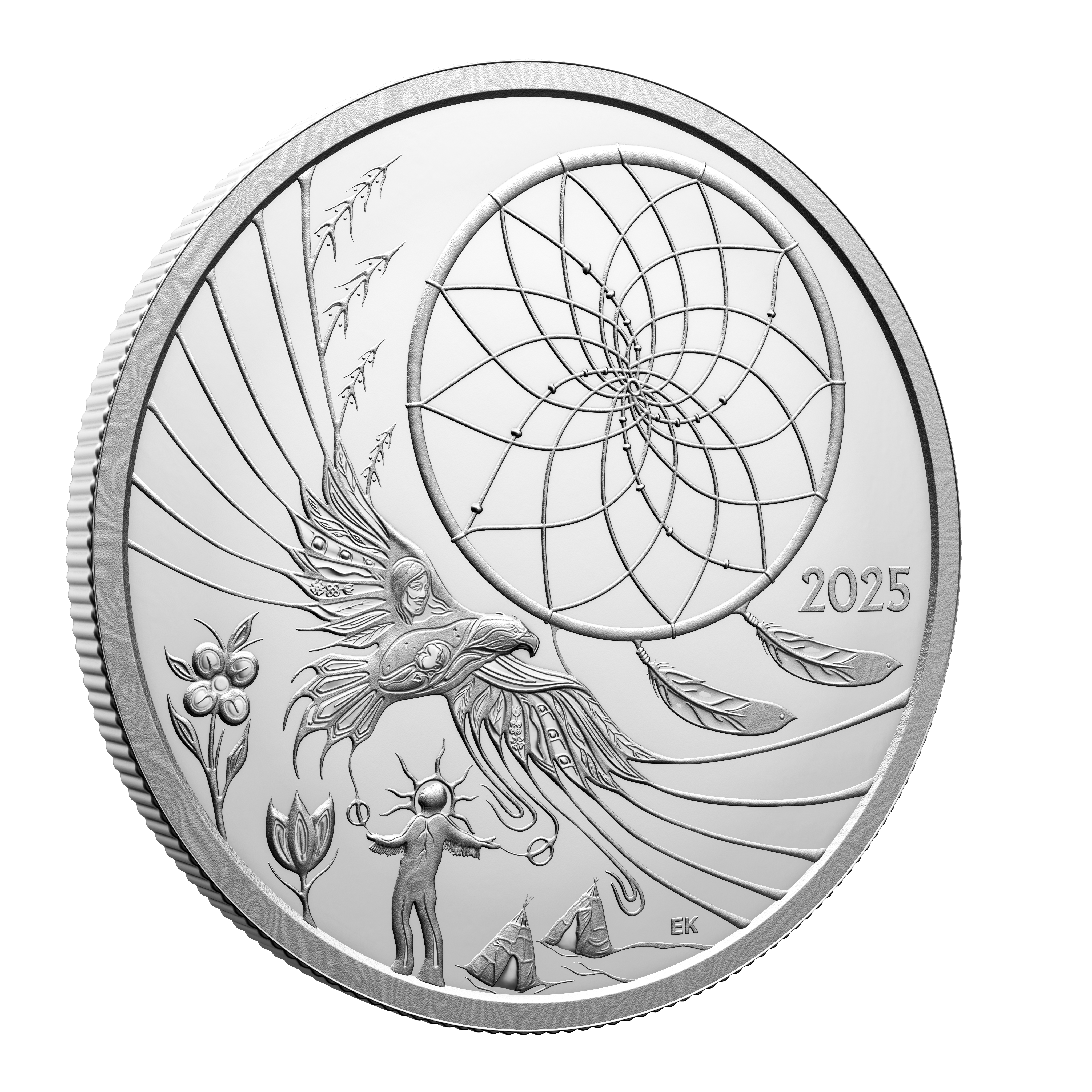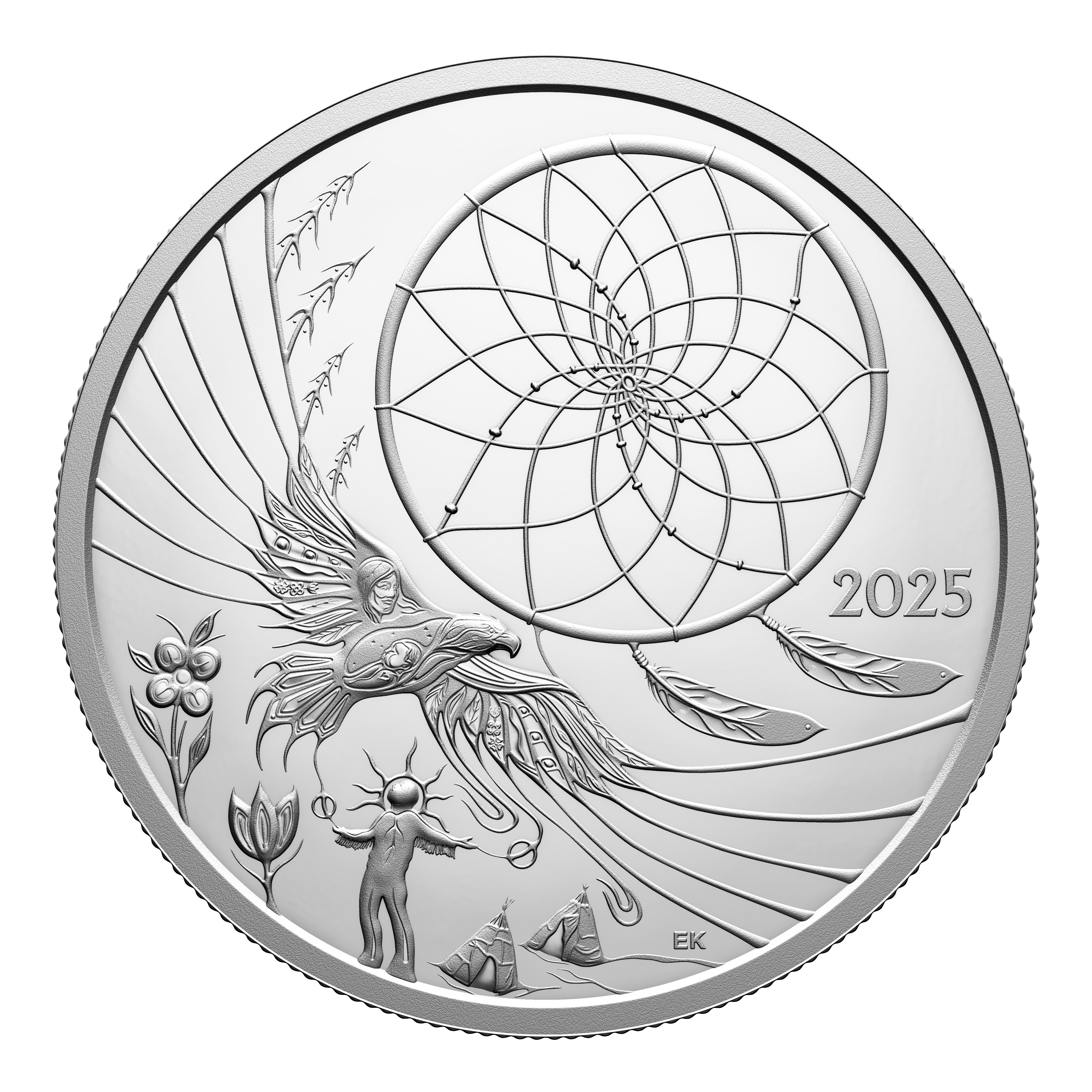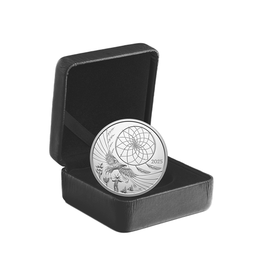 More than a collectible, this 99.99% pure silver coin is a powerful tribute to Ojibwe heritage, brought to life through the artist’s representation of the dreamcatcher tradition. Crafted with deep intentionality, the design focuses on a matriarch—the creator of the dreamcatcher featured here—who is also seen nurturing her child within the form of the soaring Eagle that is a sacred connection to the Creator. From healing florals to wigwams representing community, every engraved element beautifully reflects the Anishinaabe understanding of balance, protection and the interconnectedness of all living things.